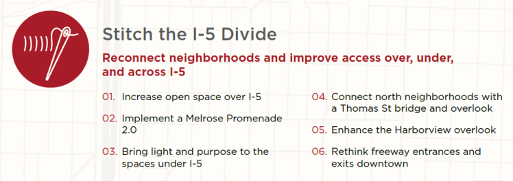 This is a major milestone for the Lid I-5 campaign. In addition to being enshrined in the Seattle Comprehensive Plan, part of WSDOT’s federal planning grant application, and endorsed by city and state officials, Lid I-5 will leverage Imagine Greater Downtown to launch important next steps. The plan includes at least two critical work items for the City: