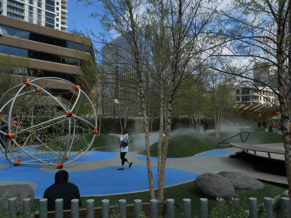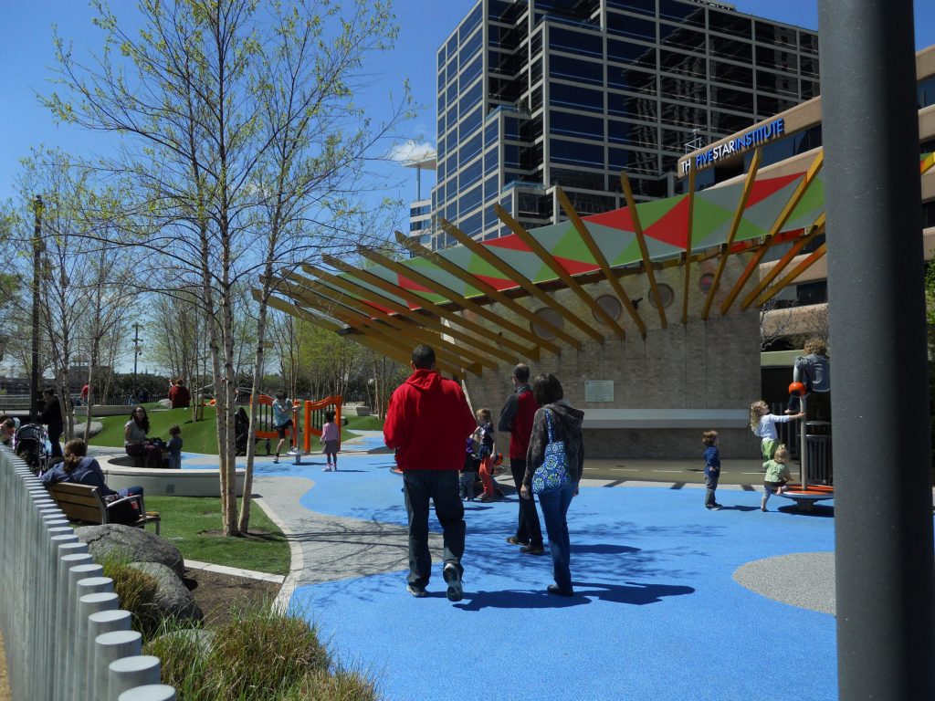 Recognized by the Urban Land Institutes’s 2014 Urban Open Space Award, Klyde Warren Park has transformed the arts and culture hub of Downtown Dallas. It was built over eight lanes of a sunken state freeway, and one overpass was closed to make a larger continuous open space. The park has unrestricted access from sidewalks around the entire perimeter and limited plantings preserve sight lines in and out of the park, making it highly safe and accessible. According to the Trust for Public Land, per acre it is among the top ten most-visited parks in the country.