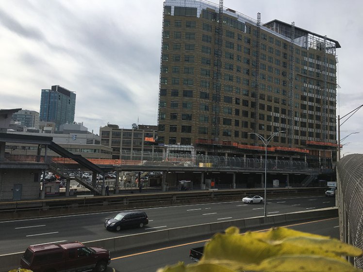 First proposed in 2002, this complex 4.5 acre private development over the Massachusetts Turnpike (Interstate 90) broke ground on its first phase in early 2018. This phase includes development on both solid ground and a 12,000 square foot lid over the freeway, supporting a pedestrian walkway above a rebuilt commuter rail station. The first phase consists of two buildings with 312 apartments and 37,000 square feet of retail space.