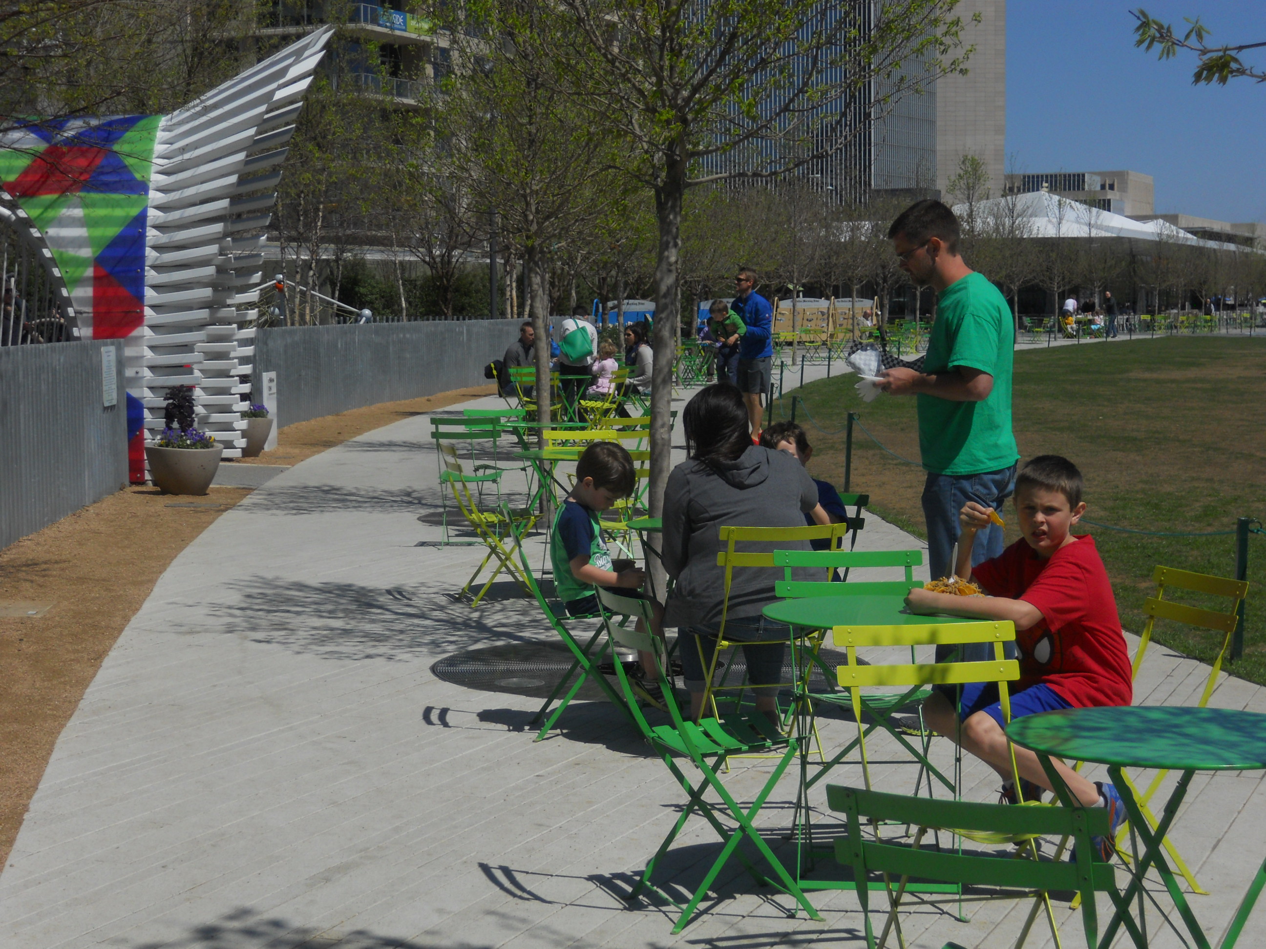 Recognized by the Urban Land Institutes’s 2014 Urban Open Space Award, Klyde Warren Park has transformed the arts and culture hub of Downtown Dallas. It was built over eight lanes of a sunken state freeway, and one overpass was closed to make a larger continuous open space. The park has unrestricted access from sidewalks around the entire perimeter and limited plantings preserve sight lines in and out of the park, making it highly safe and accessible. According to the Trust for Public Land, per acre it is among the top ten most-visited parks in the country.