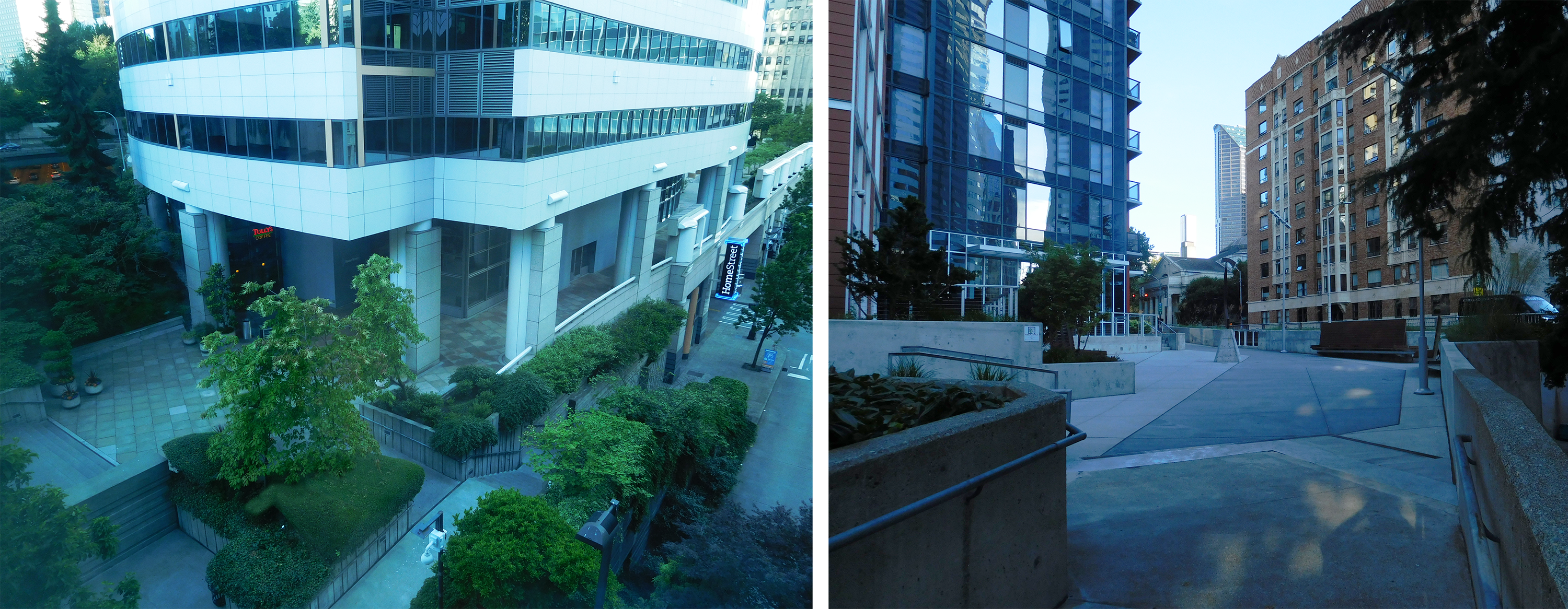 North of Park Place is the Union Square complex, which has two office towers built in 1981 and 1989. During the second tower’s planning, developer Unico Properties paid for a small courtyard outside an upper lobby that creates another access point into Freeway Park and a connection to Union Square’s elevated retail courtyard on 6th Avenue.