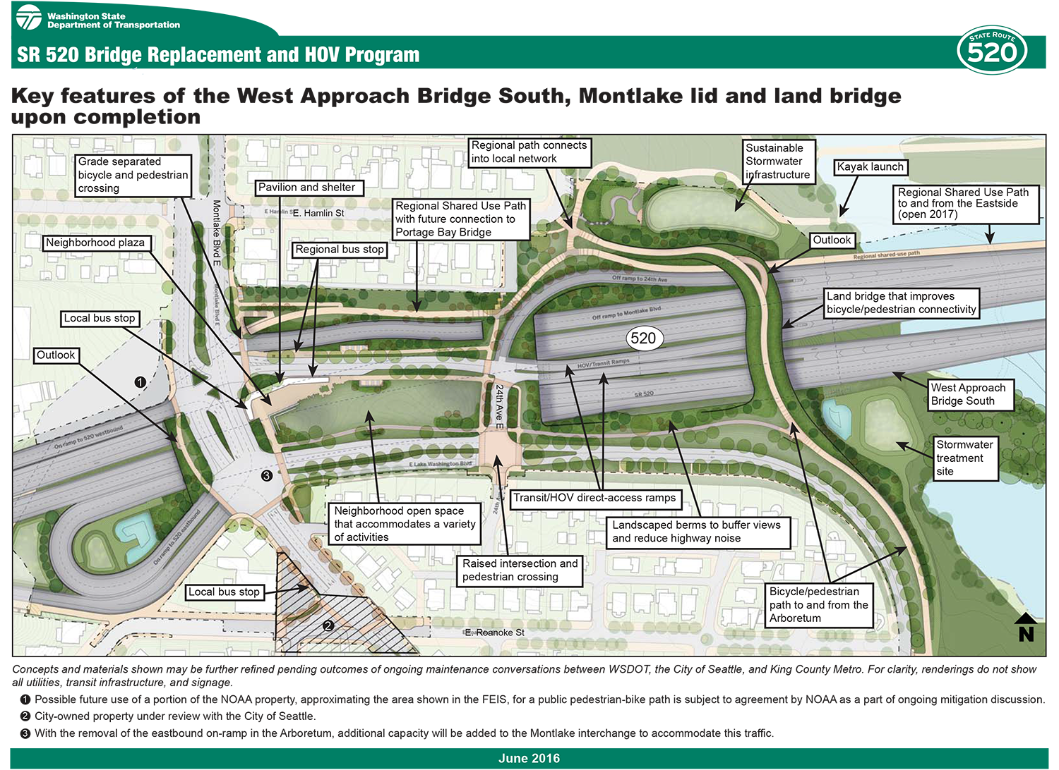 In addition, WSDOT conducted extensive community outreach where SR-520 will be rebuilt through Seattle and decided to design two more lids in the Montlake and Roanoke neighborhoods. The Montlake lid will serve a similar transit purpose and provide a bus stop, trail connections, and plantings while the Roanoke lid will be a small park. These two lids and rest of the connection to Interstate is planned to begin construction in 2018; see the Case Studies page for more information.